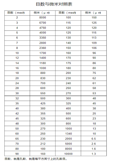 目數與微米對照表